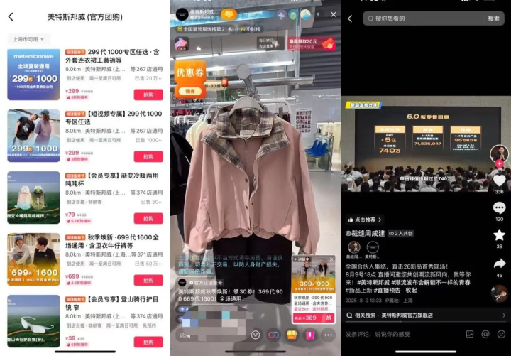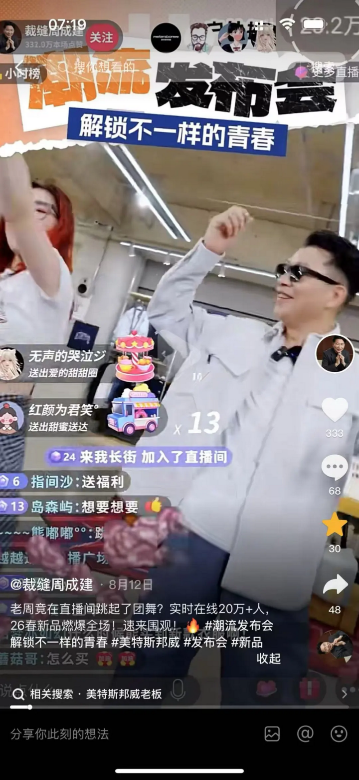 骨子上,这场激励接头的直播发生在一个多月前。8月9日,好意思特斯邦威在“成衣周成建”的抖音直播间进行26春夏新品发布会。60岁的好意思邦衣饰董事长周成建戴着玄色墨镜跳起团舞,配景音乐是品牌历史代言东谈主周杰伦的《阳光宅男》。周成建抖音公布,当晚这场直播的在线不雅看东谈主数超20万东谈主。